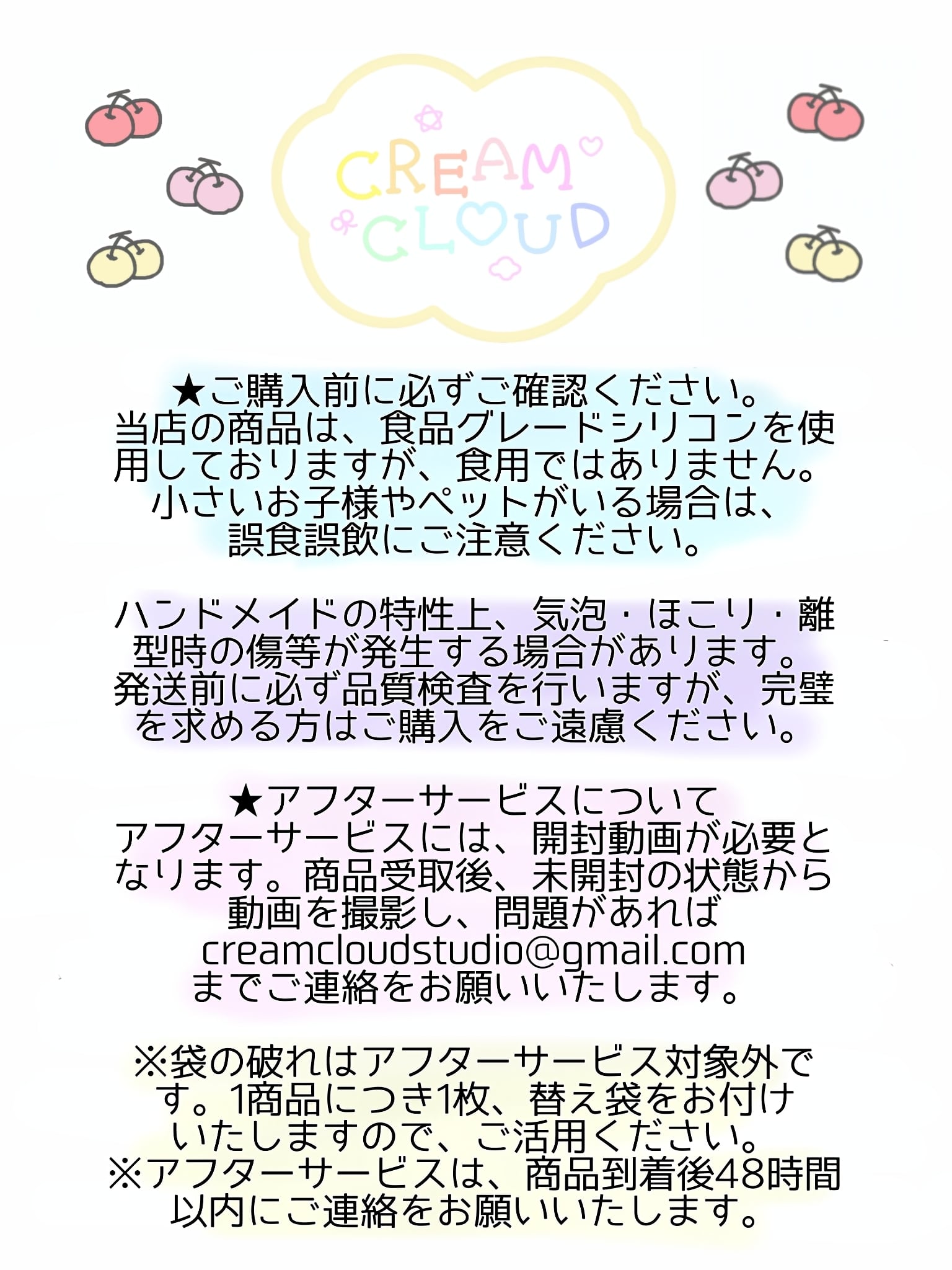 安全な食品グレードシリコンを使用し、cream cloudで1つ1つ制作しています。